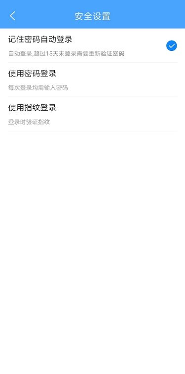 使用指纹登录,需要手机支持指纹功能方可使用,选择该选项后每次登录需要验证指纹,指纹验证失败时也可以选择使用密码登录;