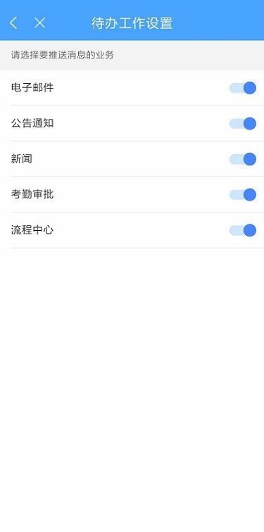 点击顶部的设置按钮,可以设置需要推送消息的业务,关闭后该模块的业务不会在待办中进行提示;