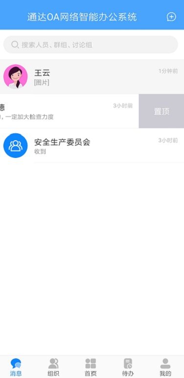 在消息列表中,支持置顶功能。针对重点关注、频繁联系、优先回复的最近联系人,可以左滑联系人选择置顶,这样既可以方便、及时的查看和沟通,又可以节约办公时间。