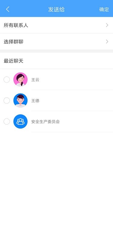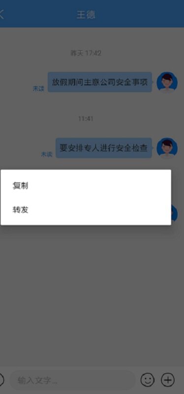 聊天消息,支持转发功能。针对重要的,需要共享的消息,可以在聊天界面中长按消息,选择转发,最多可选择9条消息,转发给最近联系人、群组、组织架构三个分类下的联系人,转发给的联系人最多也为9个。