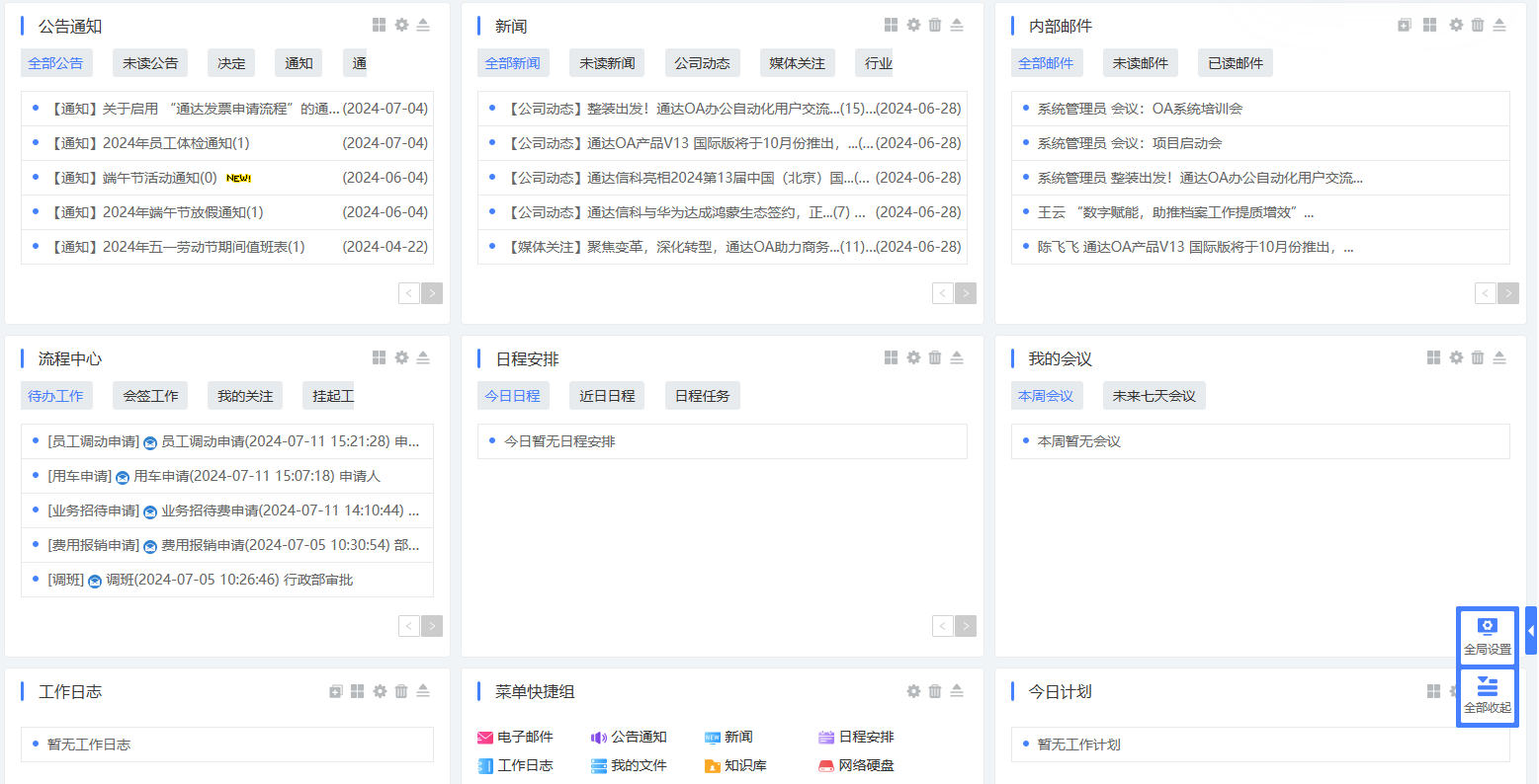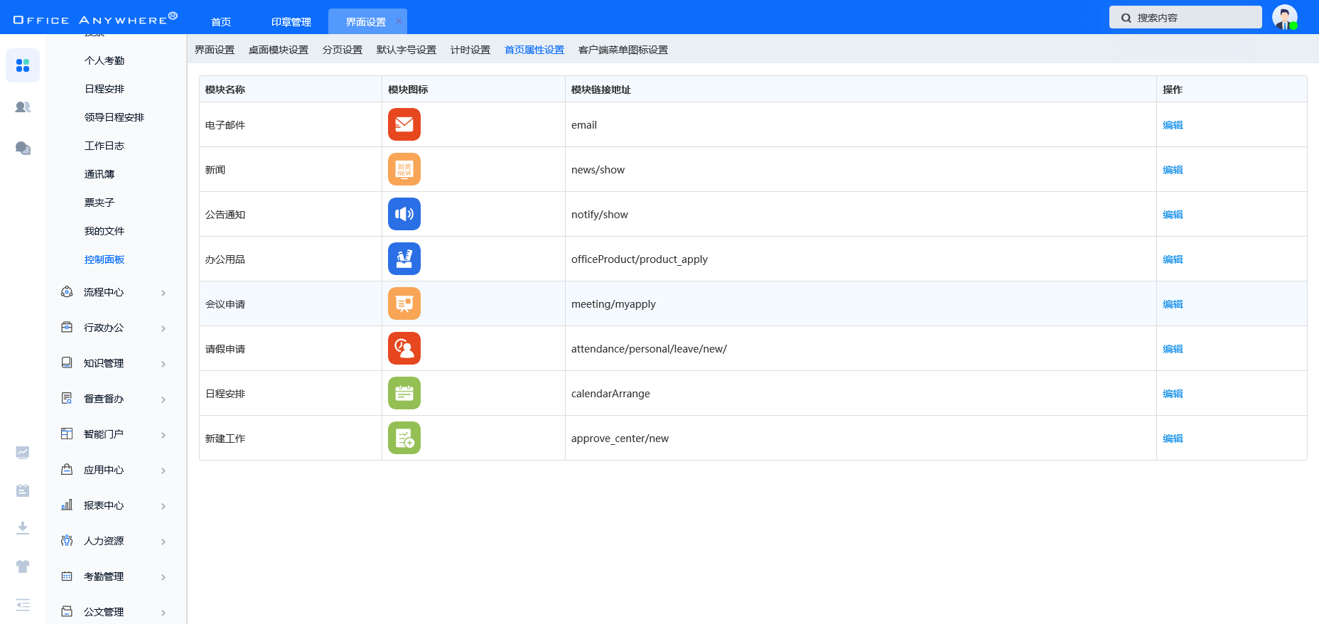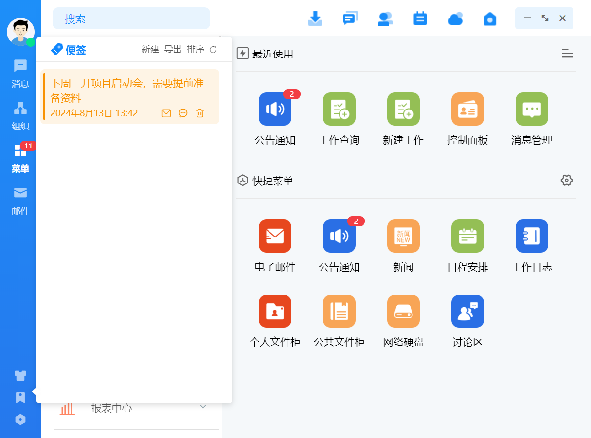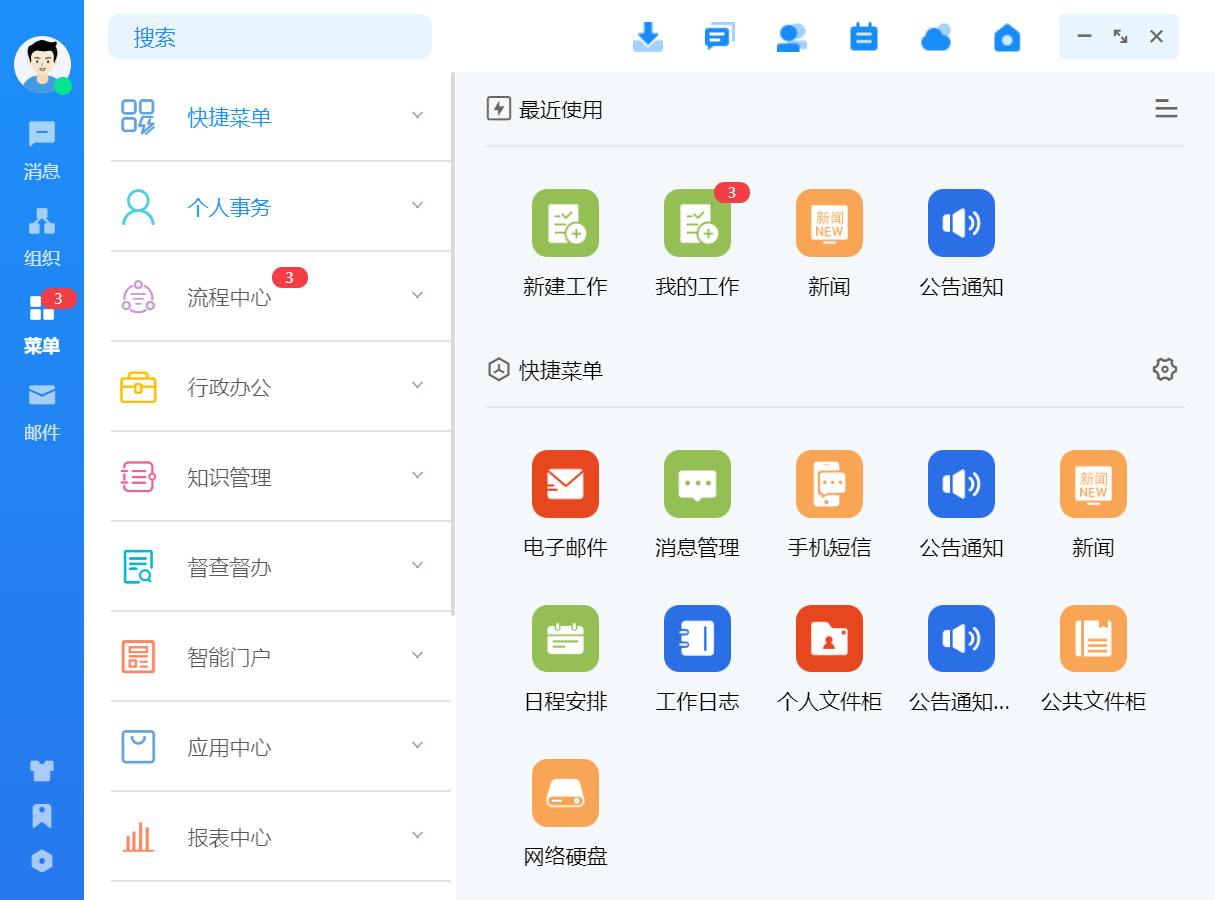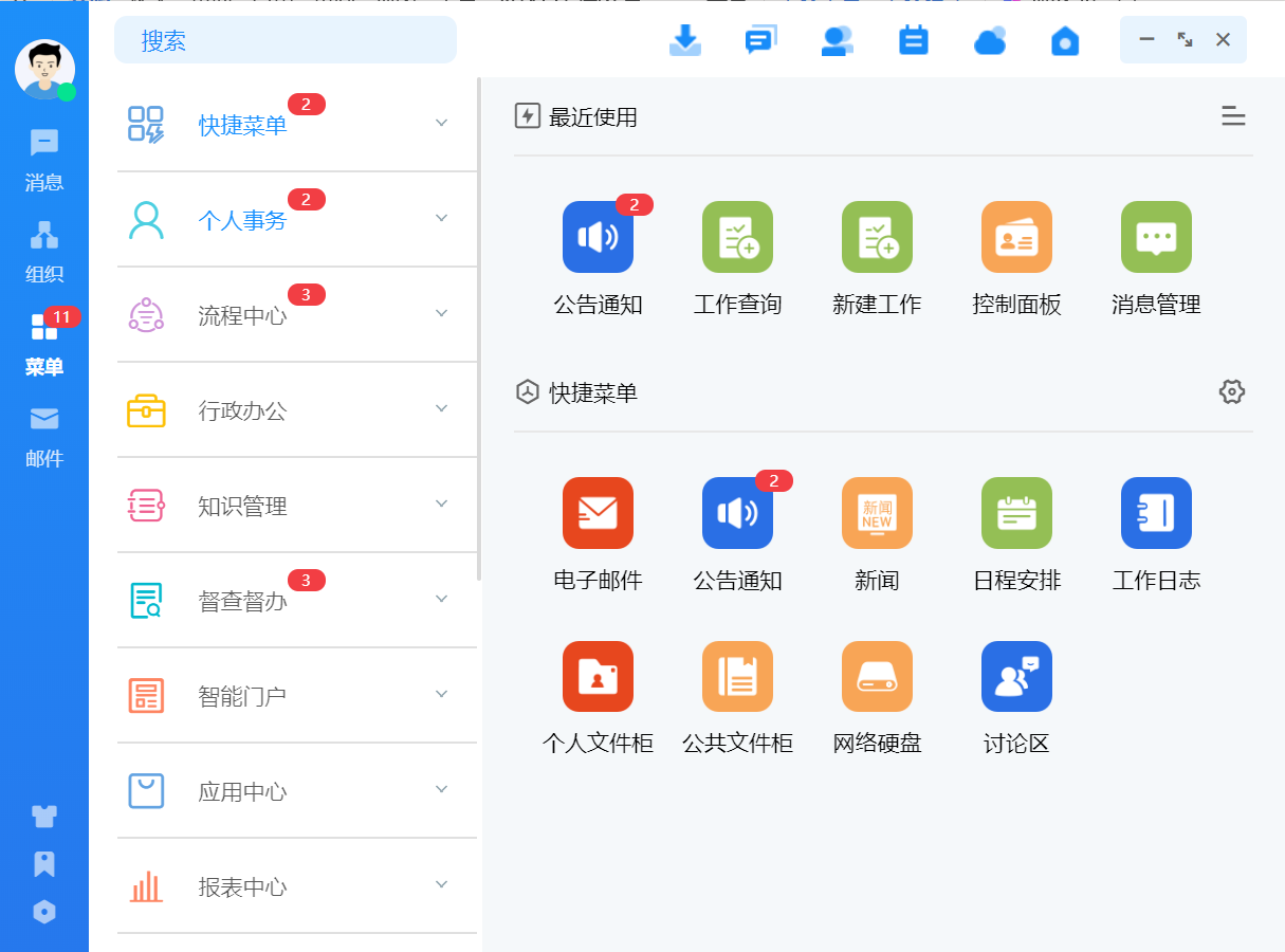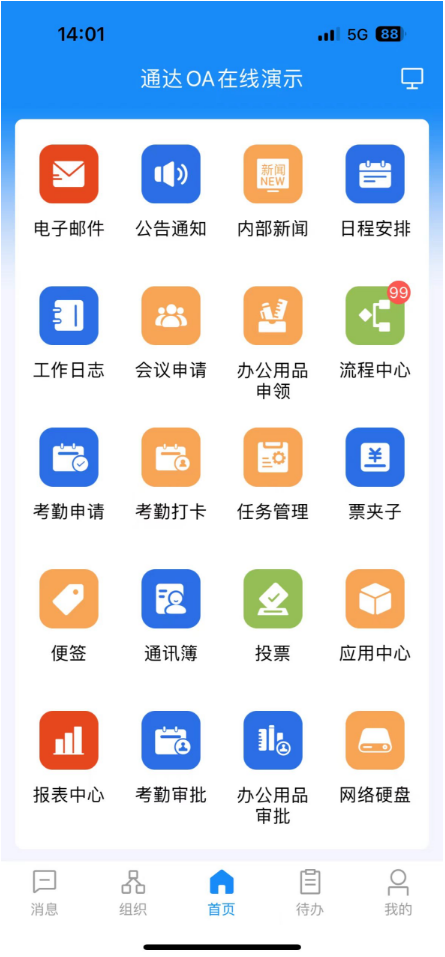 首页会展示所有权限的 OA 业务模块,点击图标可进入相应业务模块。