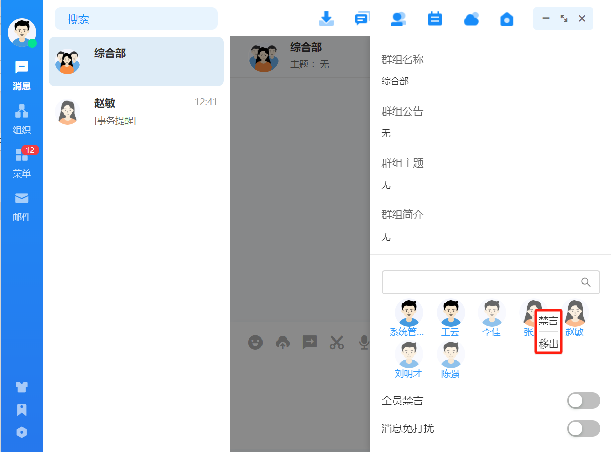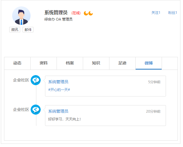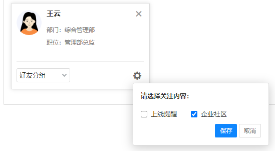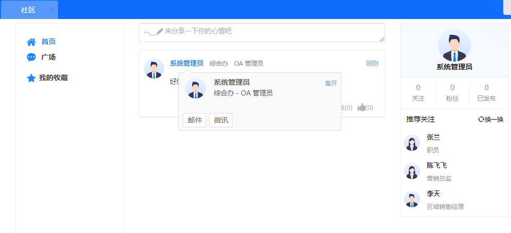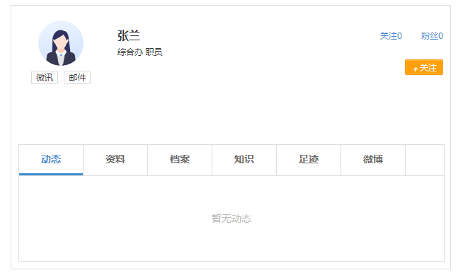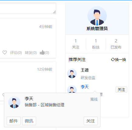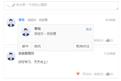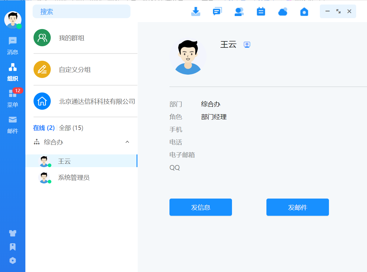 组织架构根据部门层级进行显示,点击用户会显示该用户的基本信息,可对用户发消 息、发邮件等操作。
