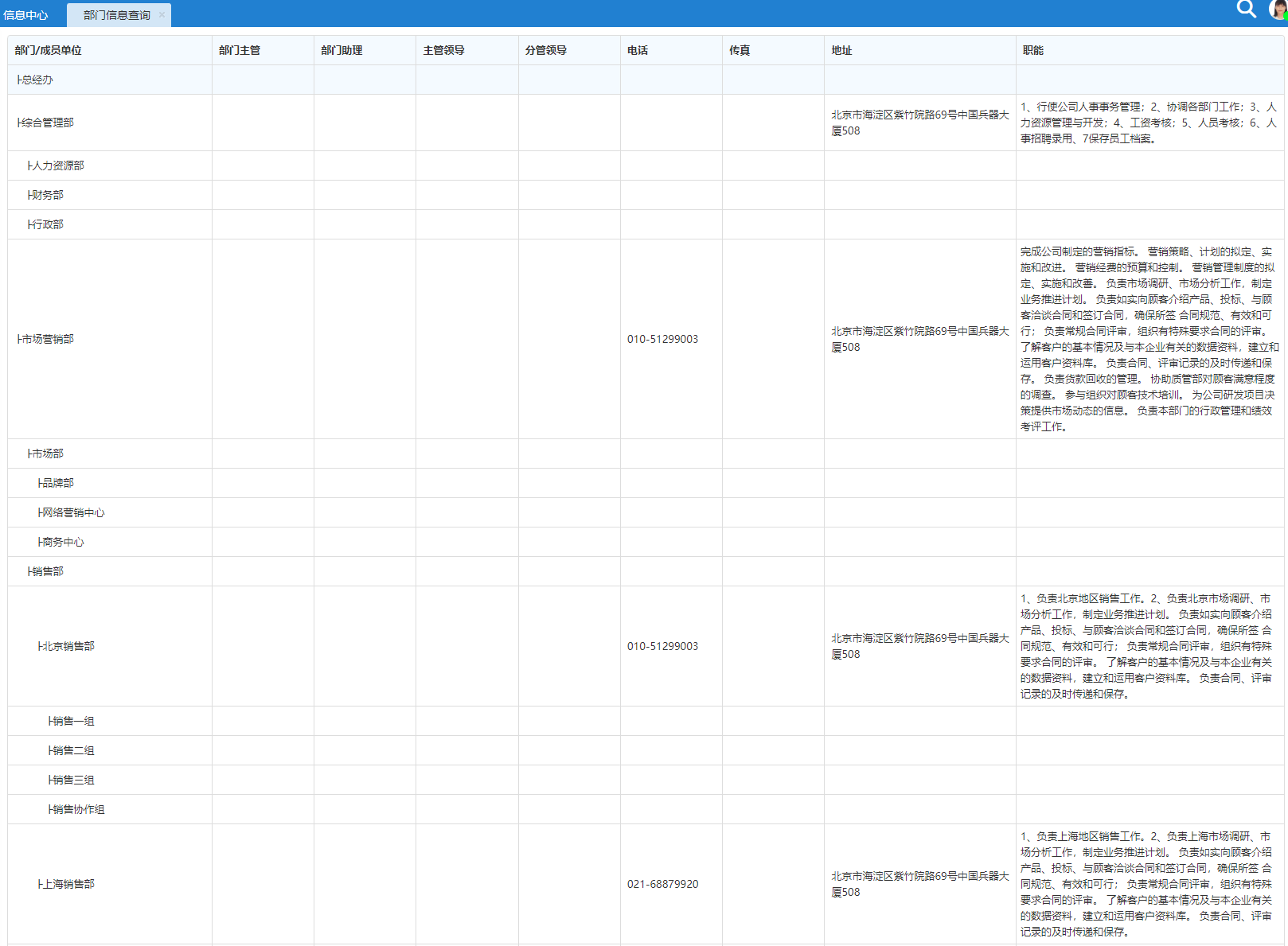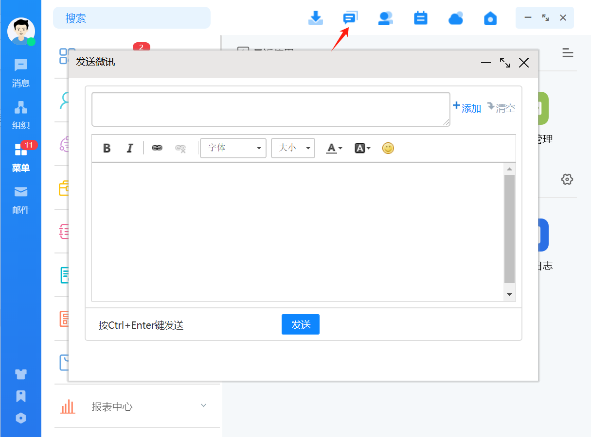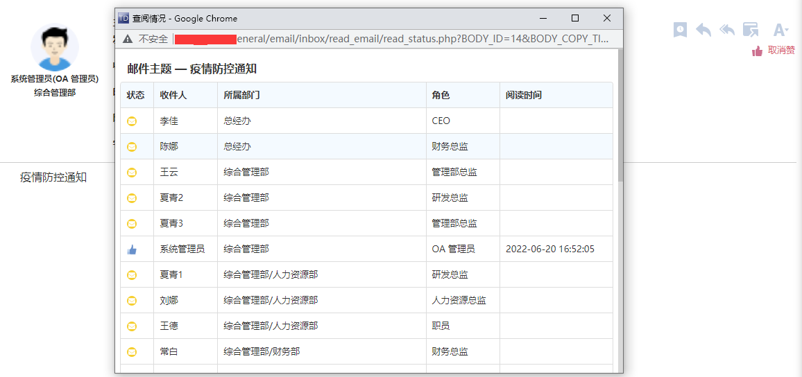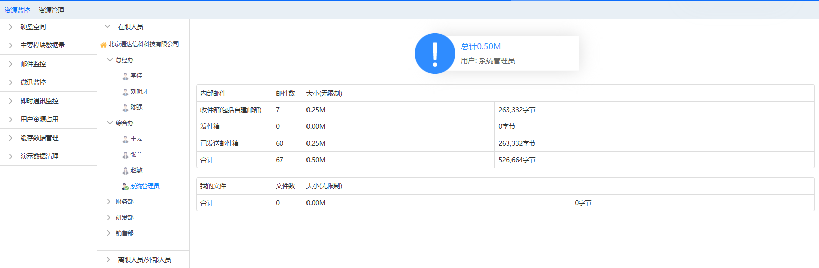 组织架构根据部门层级进行显示,点击用户会显示该用户的基本信息,可对用户发消 息、发邮件等操作。