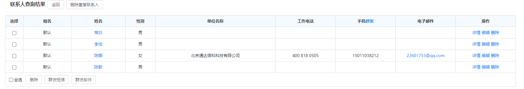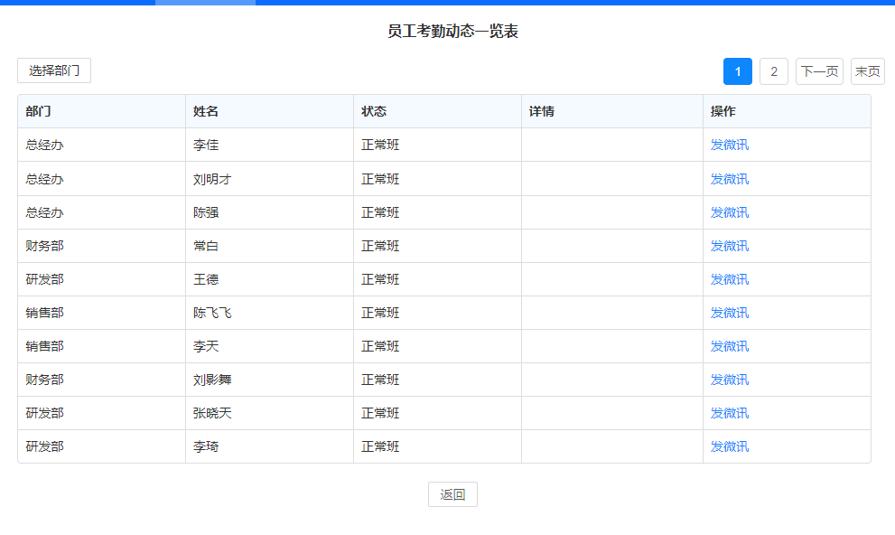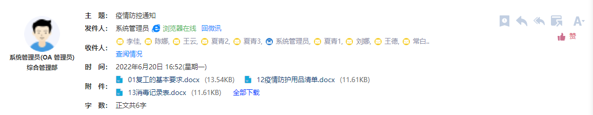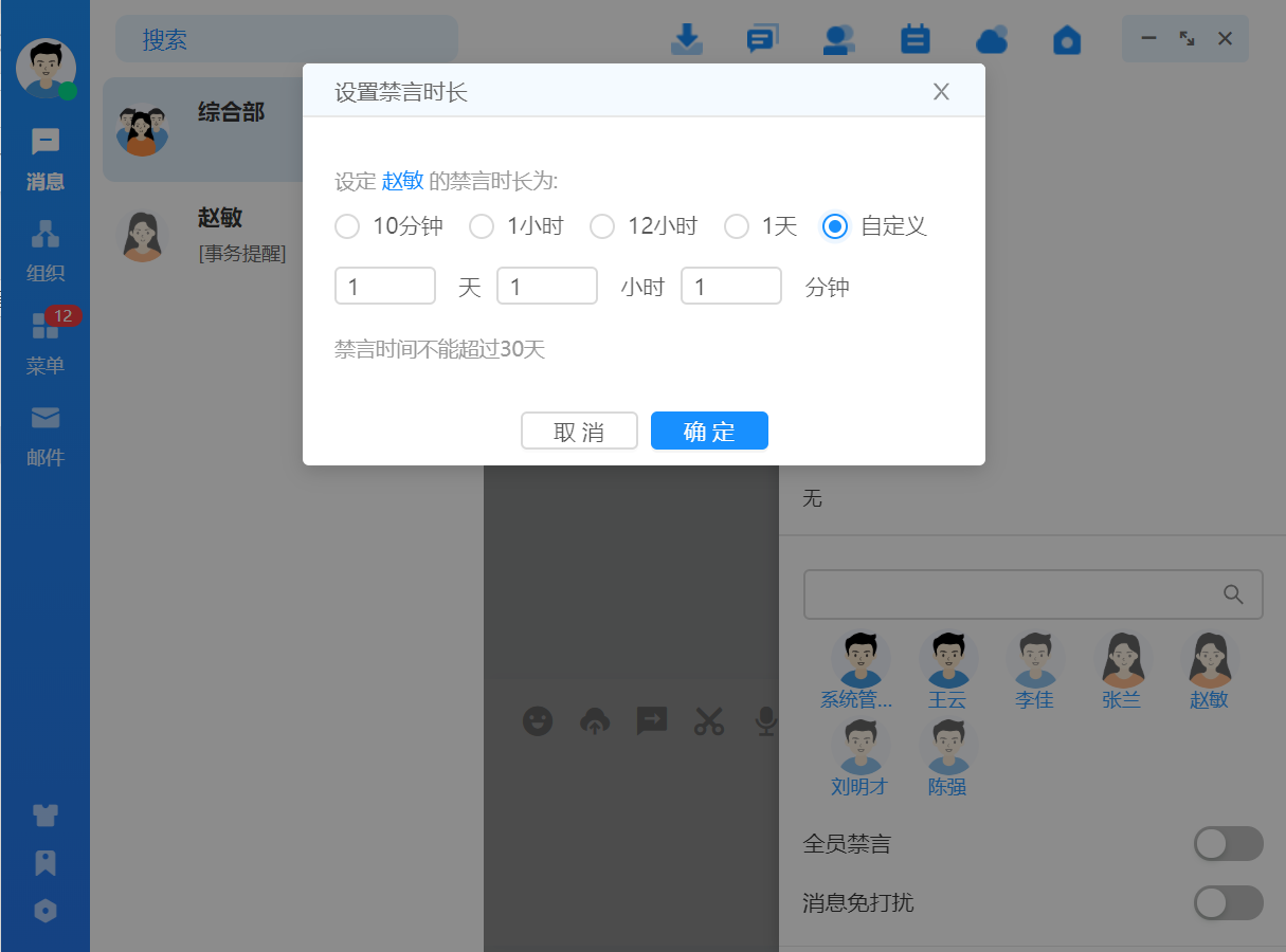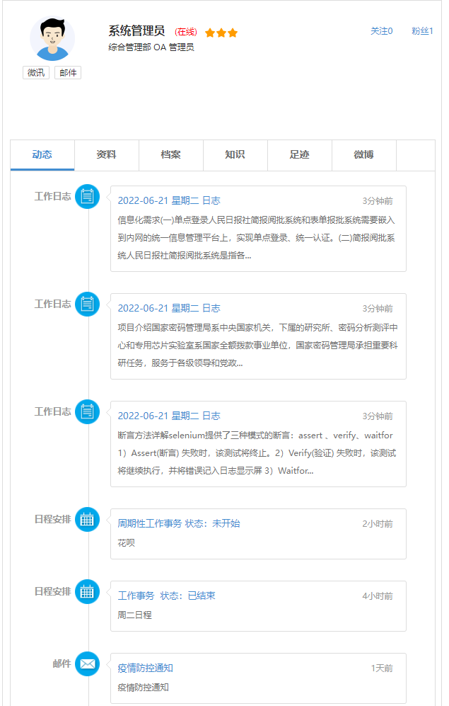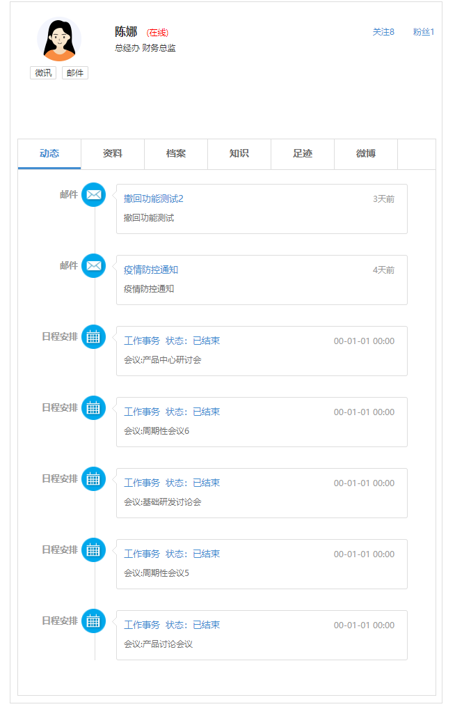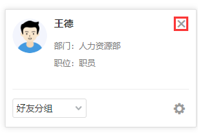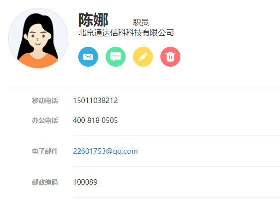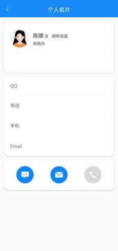 点击人员会展示当前用户的个人名片,可执行发消息、发邮件,若个人名片中有手机号 码还可直接调用手机电话功能拨打电话。