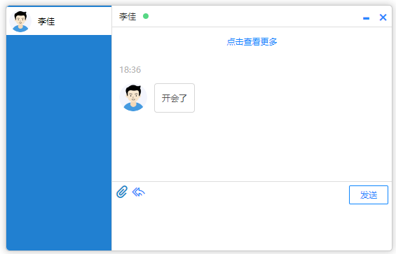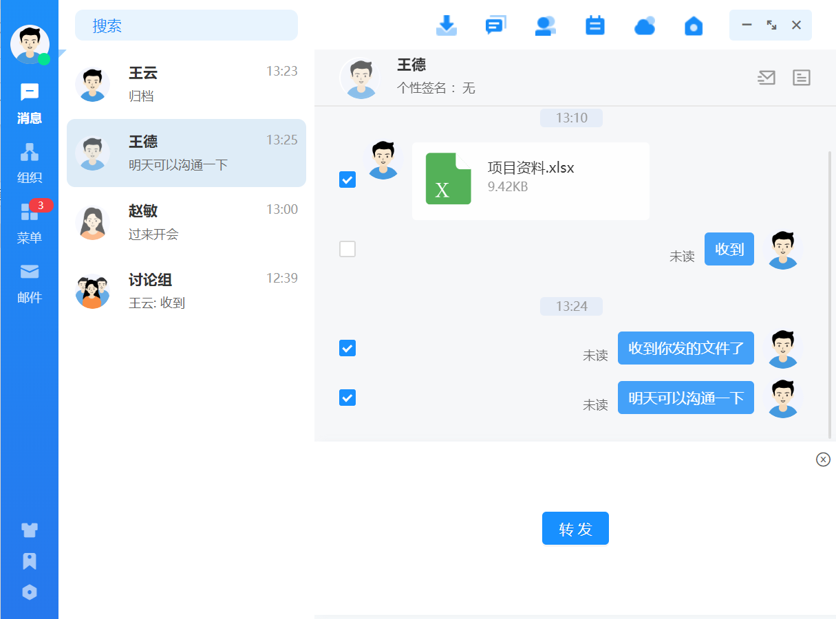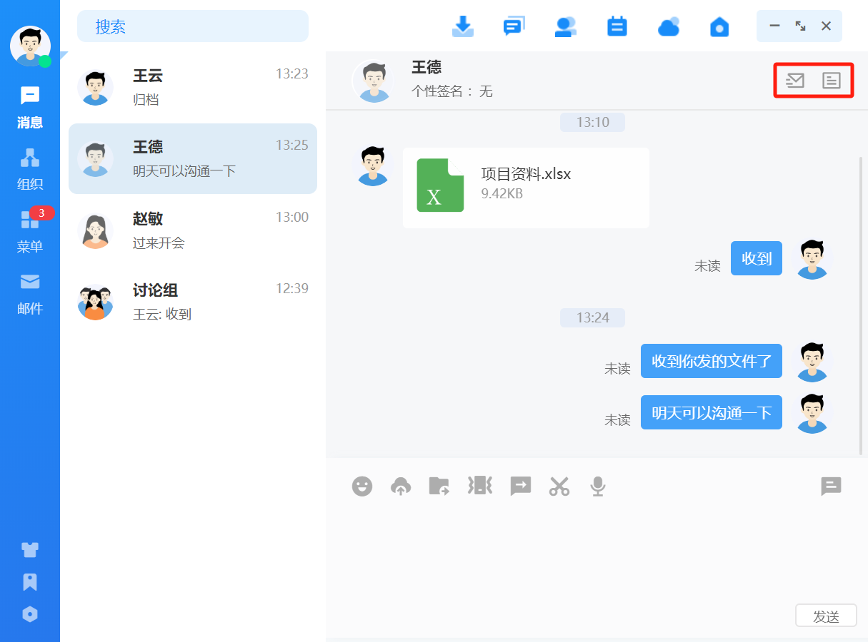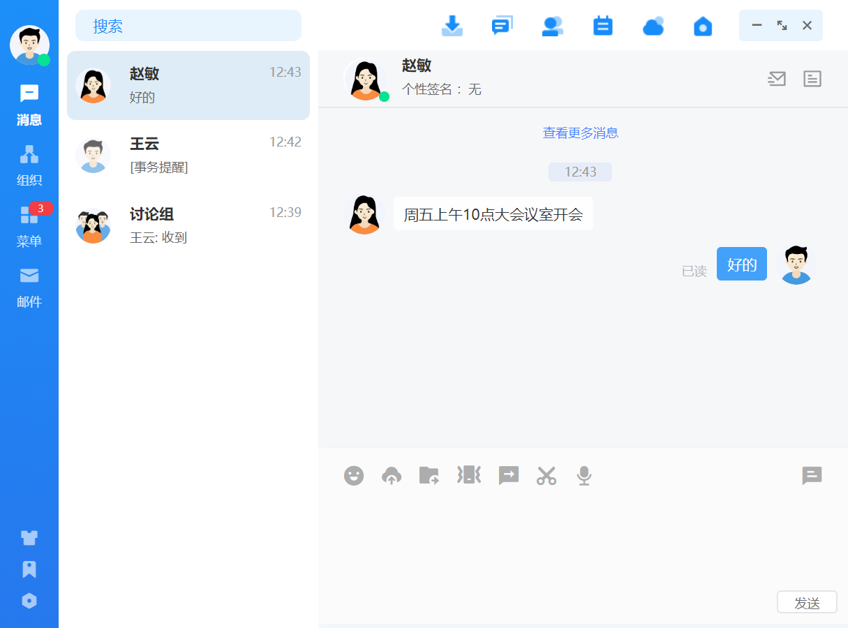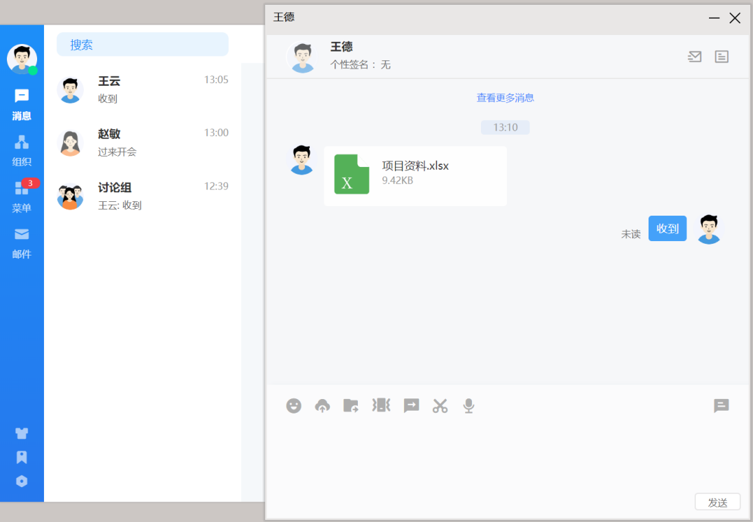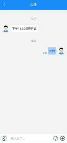 点击联系人可进入消息收发界面,消息类型支持文字、语音、图片、文件、位置、表 情,发送的消息有阅读状态标识,未读、已读清晰明了。