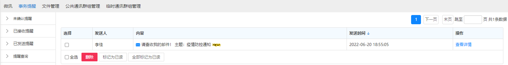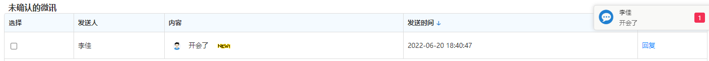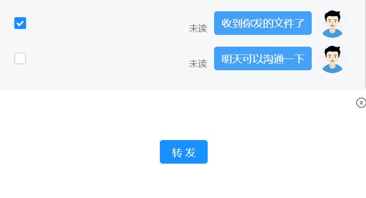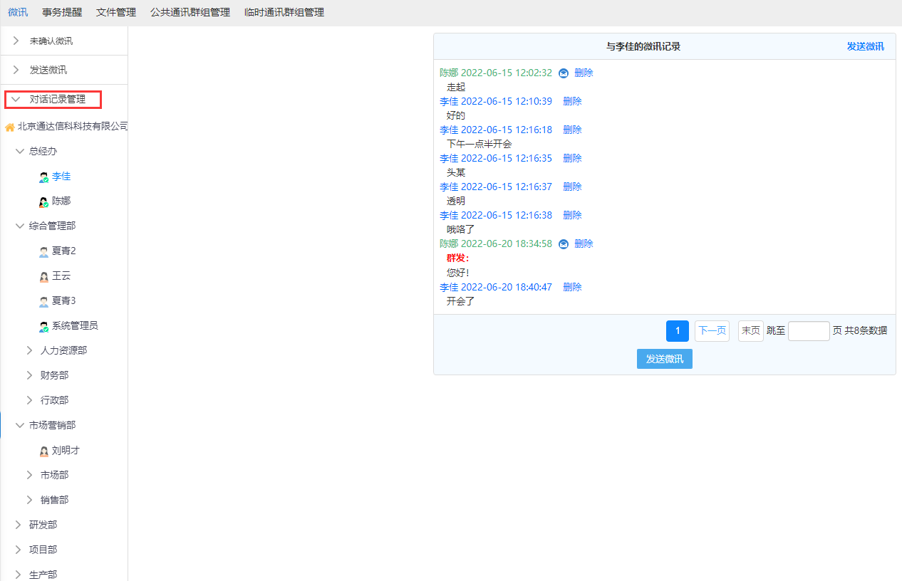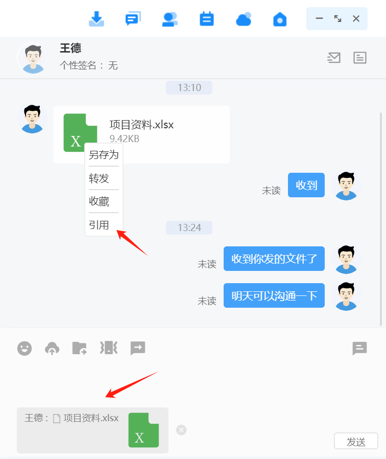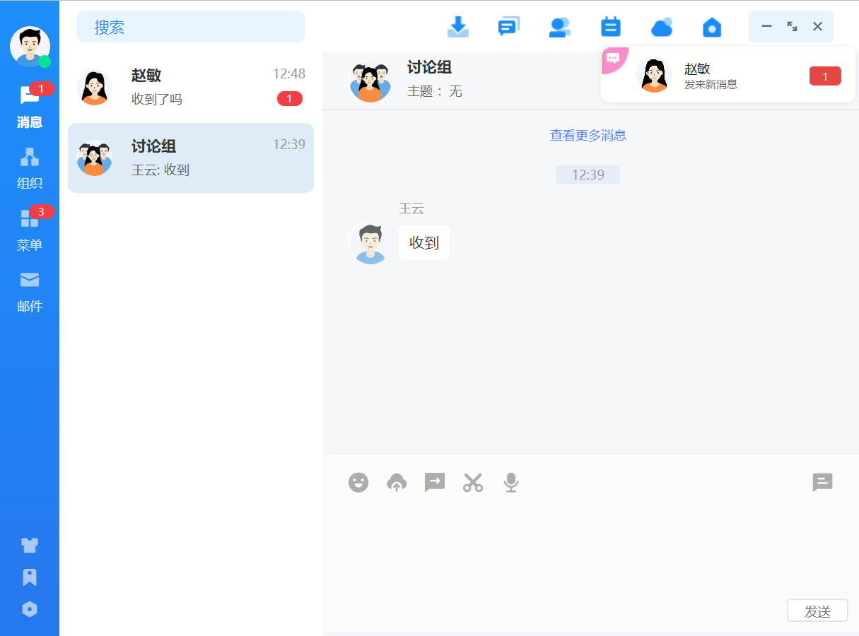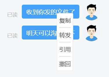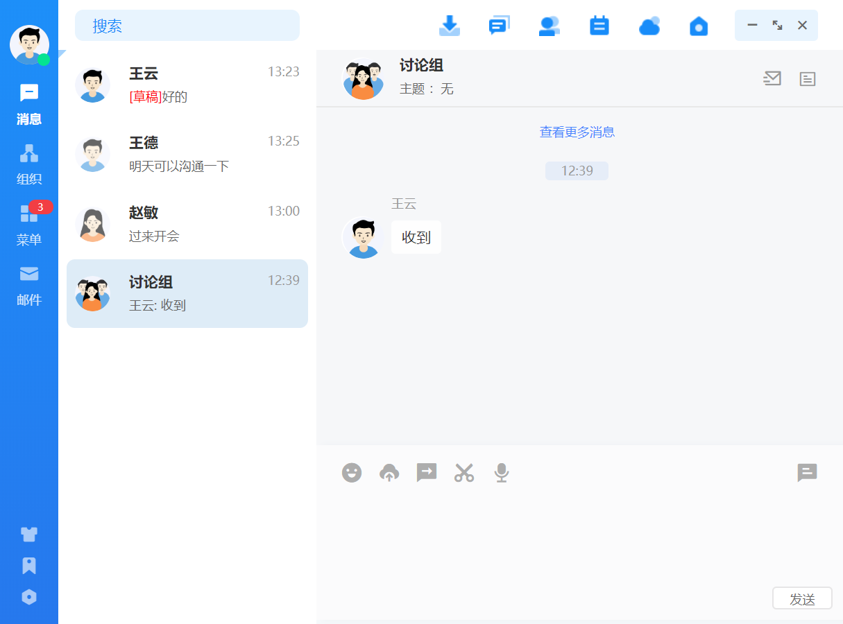 点击联系人可进入消息收发界面,消息类型支持文字、语音、图片、文件、位置、表 情,发送的消息有阅读状态标识,未读、已读清晰明了。