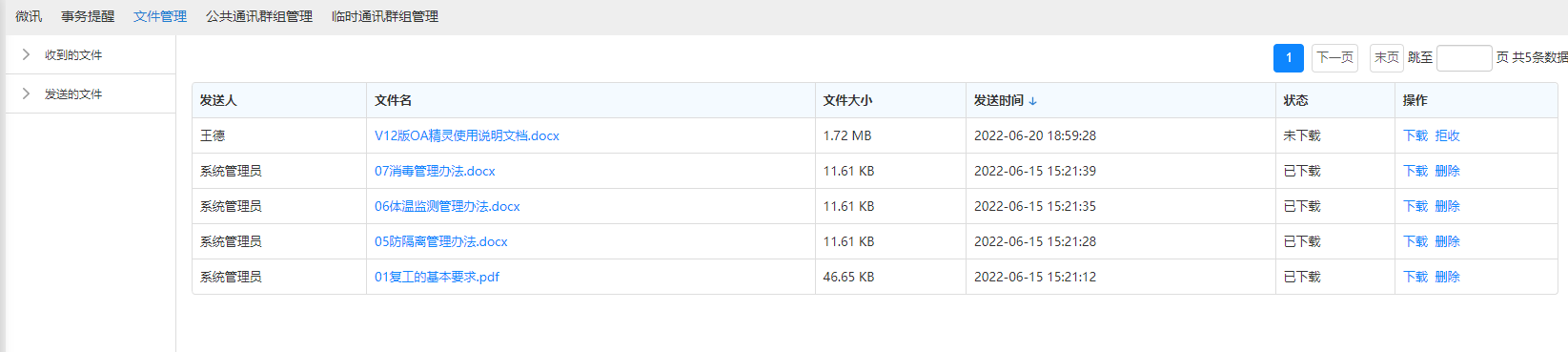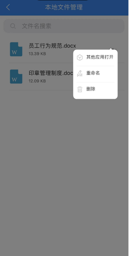 本地文件管理可以对消息中接收到的文件,业务模块附件中的文件进行重命名及删除操 作,也可以使用手机中其他 APP 打开这些文件进行查阅。