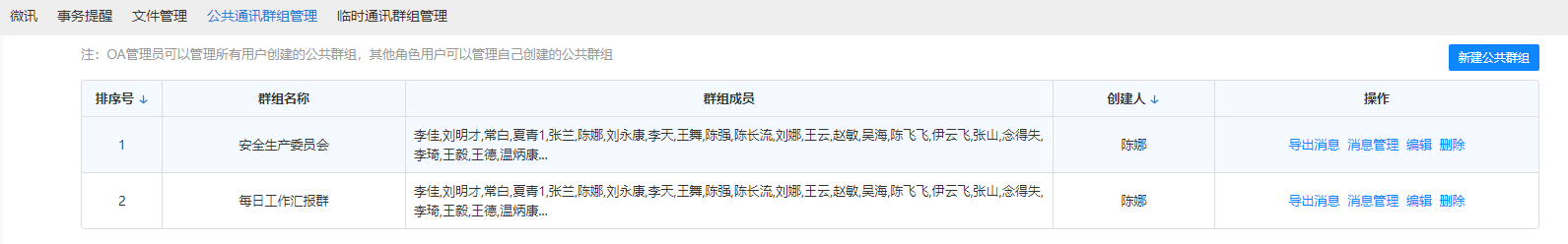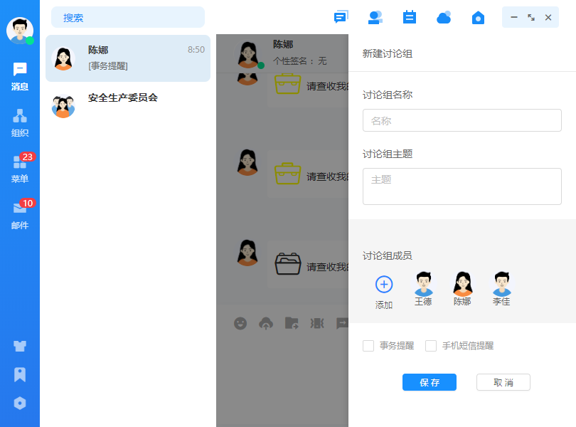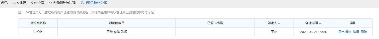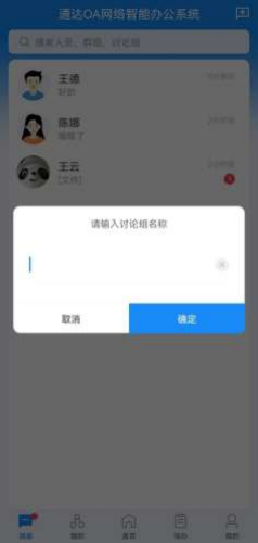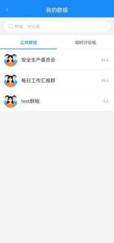 点击我的群组,可查看公共群组、临时讨论组,点击页签下的讨论组可直接打开消息界 面。