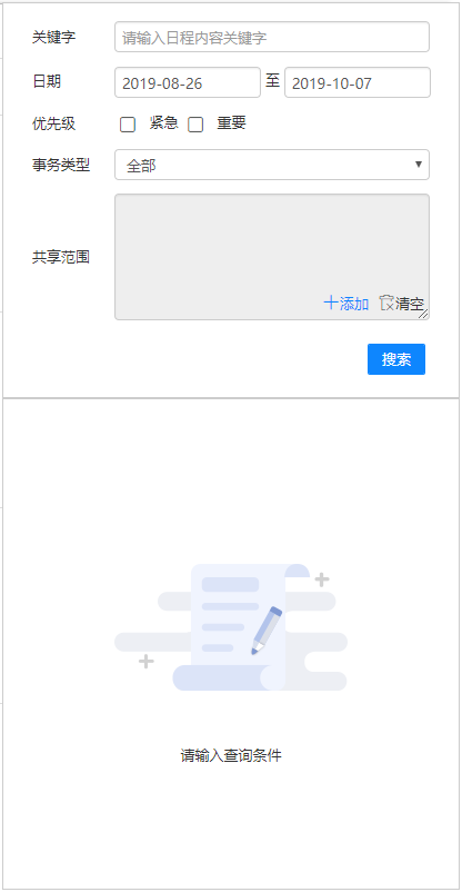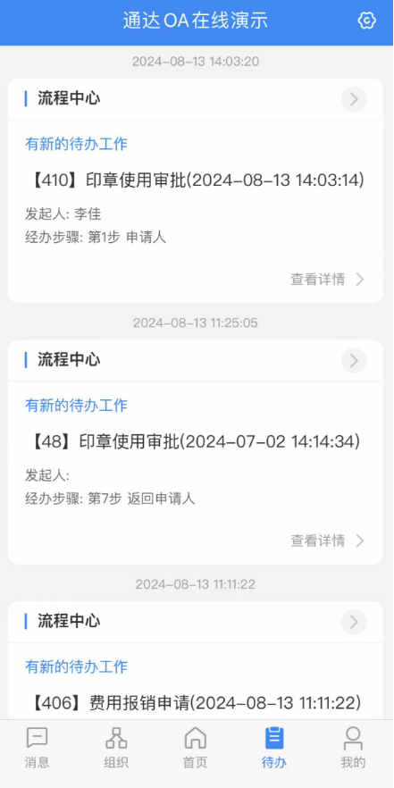 点击底部导航的待办可切换至待办页面,待办以卡片形式显示所有当前未办理的事项, 点击卡片头部可跳转至相应模块,点击查看详情会跳转至该项事务的详情页。