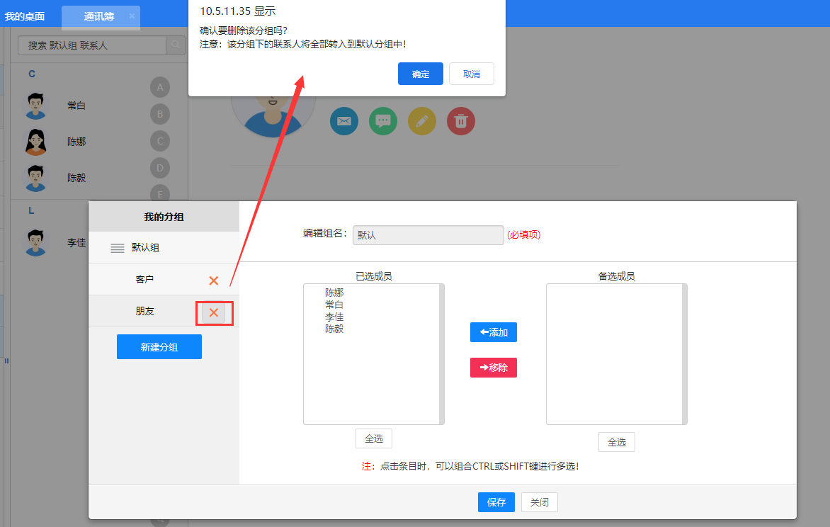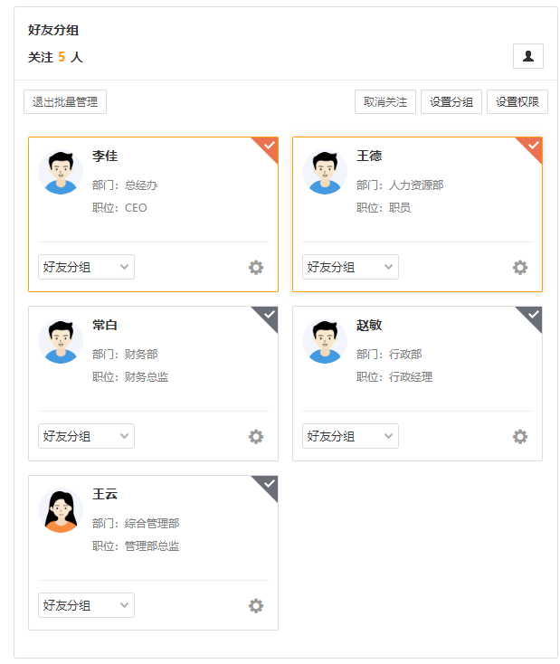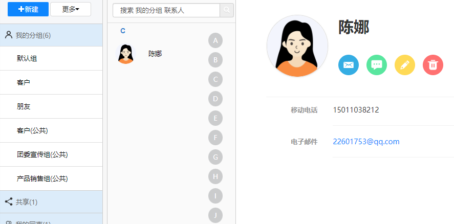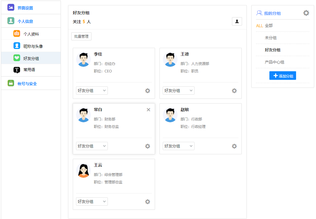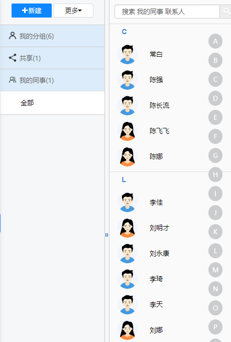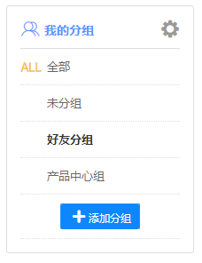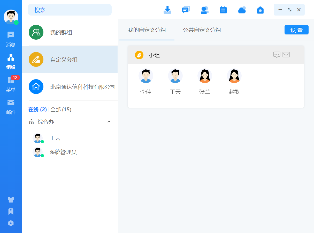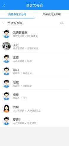 点击自定义分组,可查看我的自定义分组和公共自定义分组,点击分组名称列可展开/收 起分组内人员显示,展开分组时可查看分组内所有人员,点击人员头像可打开消息界面。