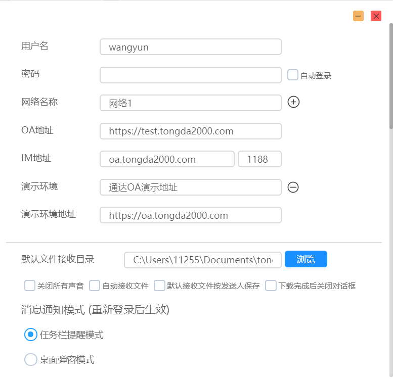 1\. 网络环境设置: 打开客户端, 找到网络环境设置, 并输入正确的 OA 地址和IM地址,例如:OA 地址是 http://oa.tongda2000.com,IM 地址是 oa.tongda2000.com 端口 1188 ,然后保存。