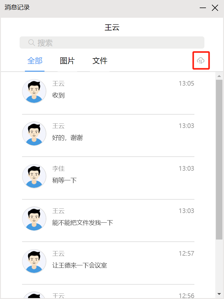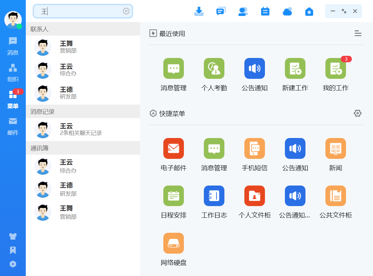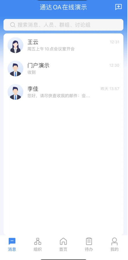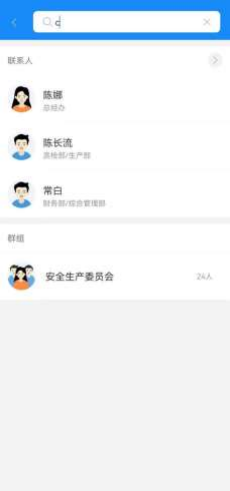 消息列表顶部的搜索栏可以搜索最近联系人中的人员、群组、讨论组,点击搜索结果可 以直接跳转至消息收发界面。