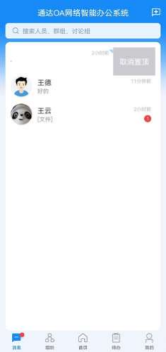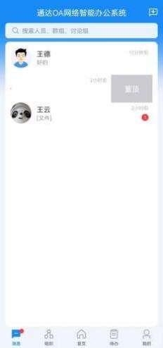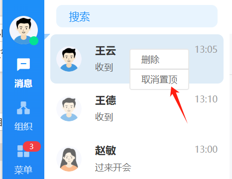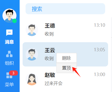在消息列表中,支持置顶功能。针对重点关注、频繁联系、优先回复的最近联系人,可 以左滑联系人选择置顶,这样既可以方便、及时的查看和沟通,又可以节约办公时间。