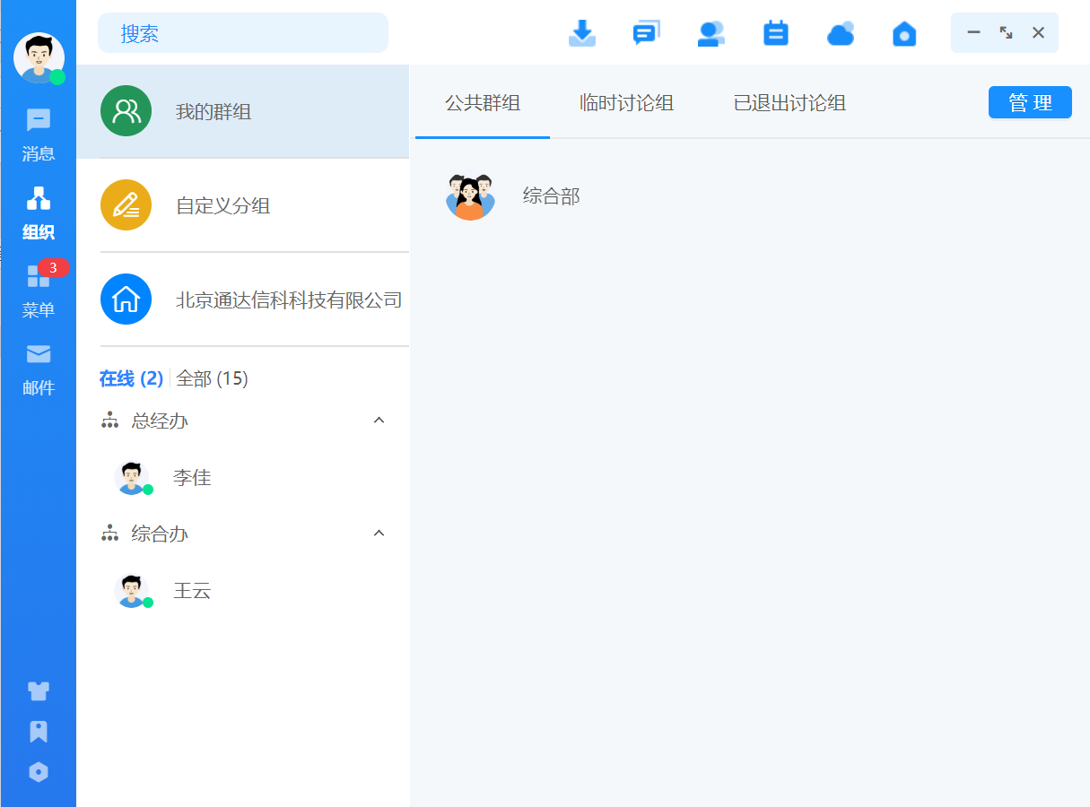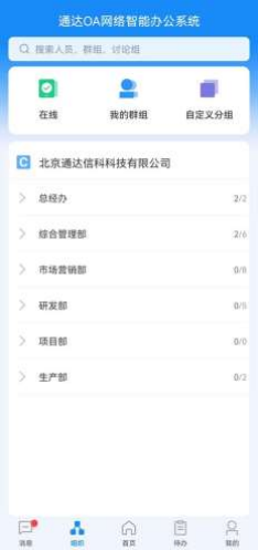 点击底部导航里的组织可切换至组织页面,此页面包含了在线、我的群组、自定义分 组、组织架构,顶部搜索栏支持搜索人员、群组、讨论组、部门。