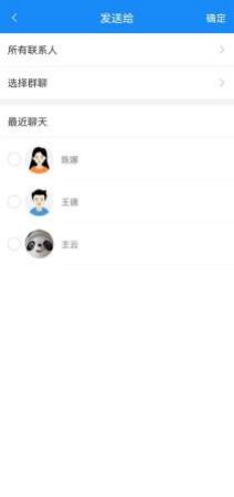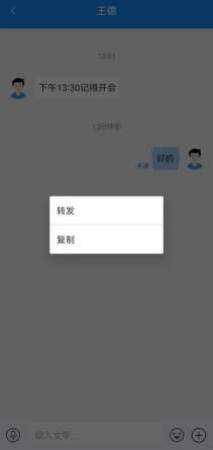 聊天消息,支持转发功能。针对重要的,需要共享的消息,可以在聊天界面中长按消 息,选择转发,最多可选择 9 条消息,转发给最近联系人、群组、组织架构三个分类下的联 系人,转发给的联系人最多也为 9 个。