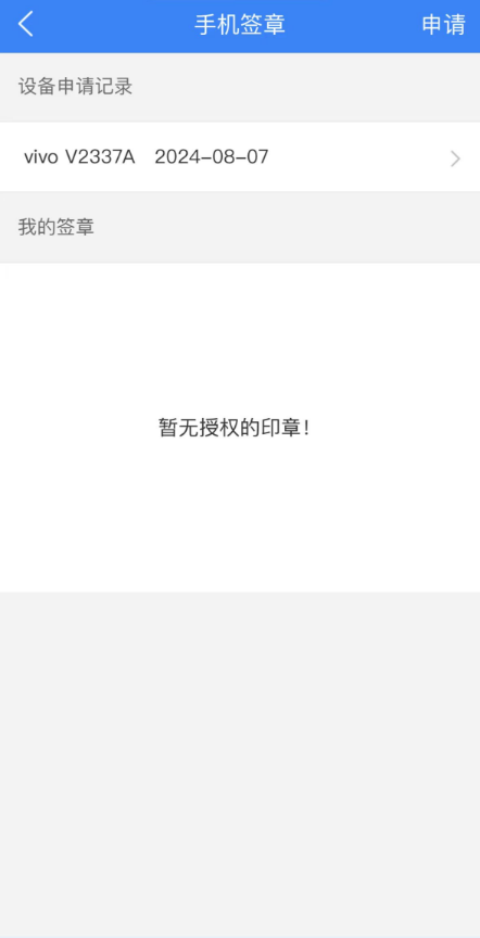 手机签章设置,主要提供给有手机盖章权限的用户使用。首先需要在手机签章设置中申 请使用签章,经签章管理员审批通过,并且分配可使用的签章后,就可以在移动端进行盖章 操作。审批通过后 ,会在手机签章设置中展示审批通过的信息,和可以使用的签章信息。