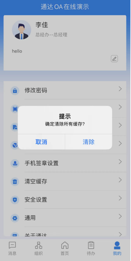 点击清除缓存后,业务模块及聊天消息的本地记录将被清除,下次打开时需要重新加 载,耗时较长,请谨慎使用。