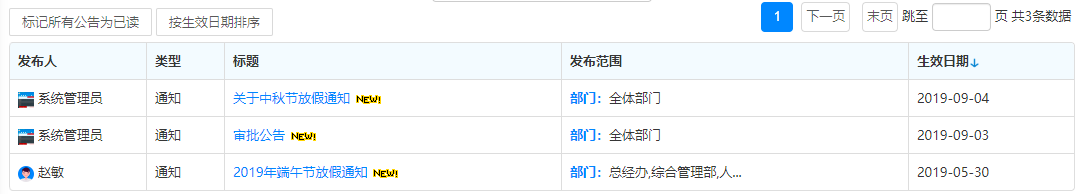 未读公告界面左下角快捷操作中有【标记所有公告为已读】按钮,点击后,未读公告中将没有数据,所有未读公告均变为已读;可点击【按生效日期排序】进行降序排列。