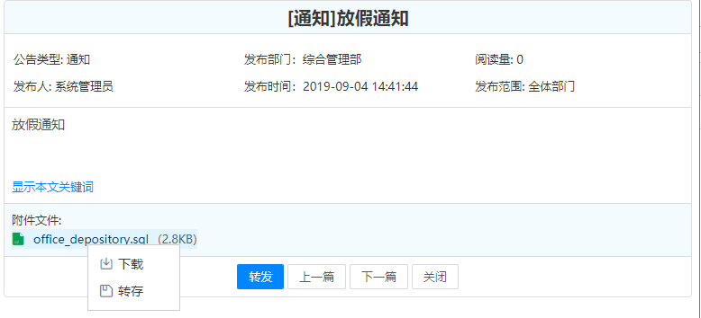 用户收到公告通知后,在未读公告中会出现;同时界面中会弹出消息提醒条,点击消息条进入公告详情界面。对于用户没有阅读过的公告通知,标题后会有个“new”图片标记。对于带附件的公告,若附件设置为允许下载,则可以看到“转存”选项,将文档转存至个人文件柜。如果附件为Office文档,点击【阅读】则直接打开文档可以实现阅读。