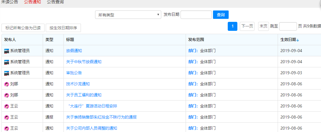 通过【个人事务】下的【公告通知】模块可以查看公告通知。发布公告通知的方法详见【行政办公】下的【公告通知管理】。