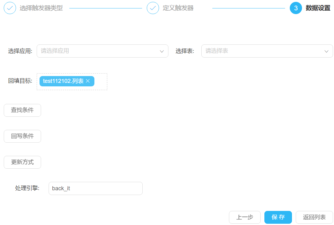 回写条件和更新方式不定义。处理引擎写上back_it。