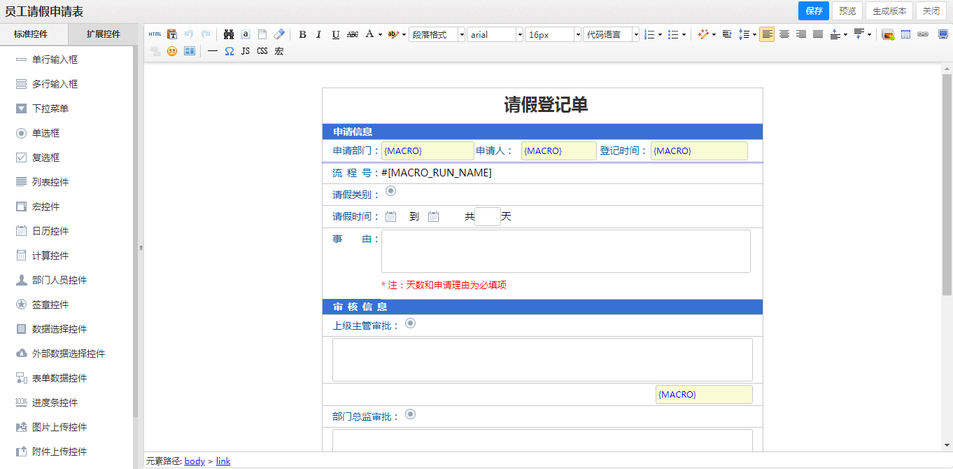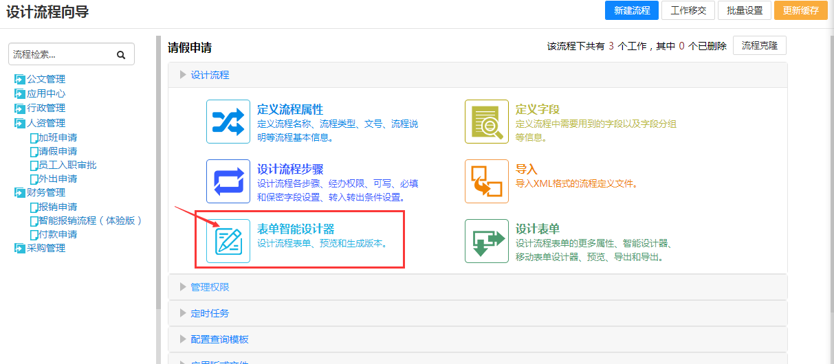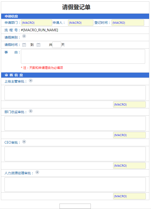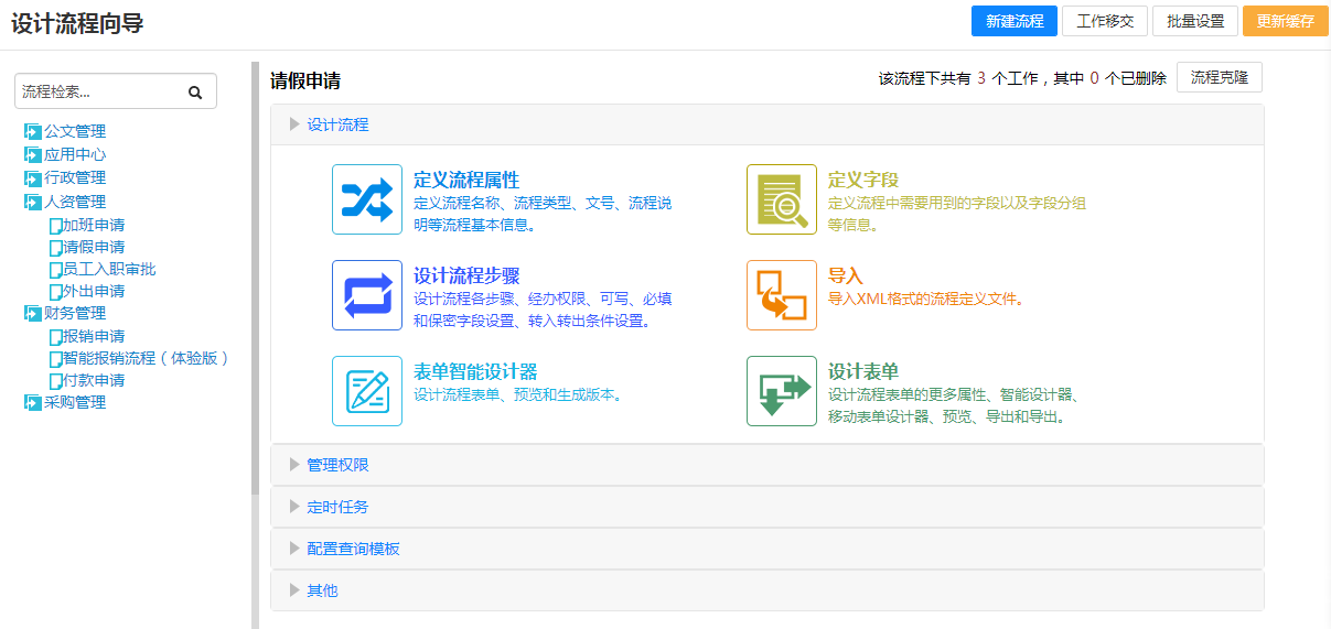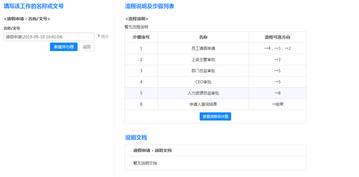 下面以“员工请假申请”为例介绍实际的流程中心程建立过程。具体过程如下: