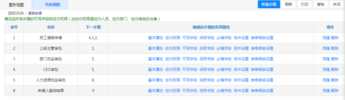 6.进入列表视图页面,设置好每一步骤的经办权限。比如:员工请假申请选择全体部门;上级主管审批选择角色为上级部门主管;部门总监审批选择人员为部门总监姓名;CEO审批选择人员为CEO姓名;人力资源总监选择人员为人力资源总监的人;申请人查看结果选择全体部门。