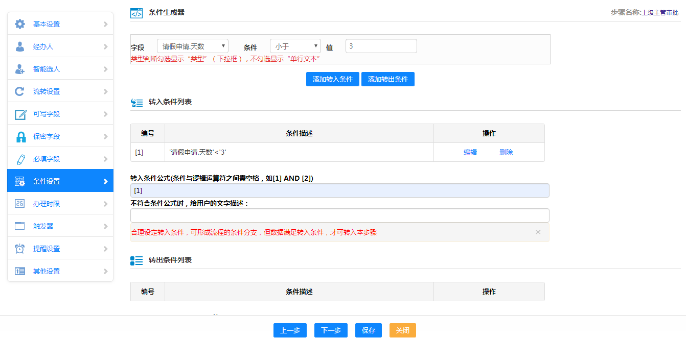 9.本实例中根据申请人角色不同以及请假天数的差异,可以在条件设置中通过设置转入条件来控制流程的走向。例如下图条件设置: