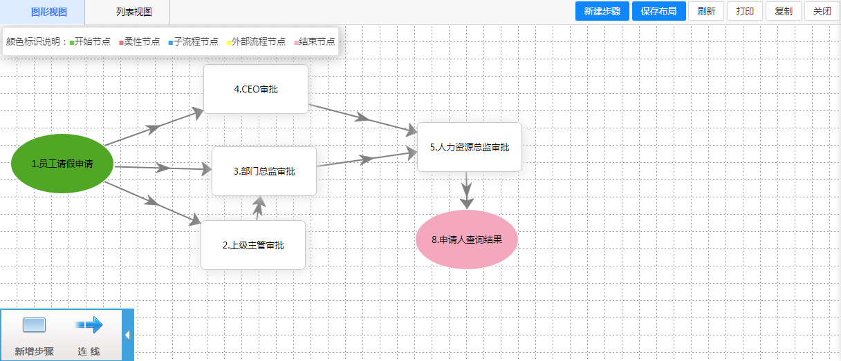 4.点击【设计流程步骤】进入流程设计器,点击【新建步骤】,添加流程的各个步骤:员工请假申请、CEO审批、部门总监审批、上级主管审批、人力资源总监审批、申请人查询结果,如下图。