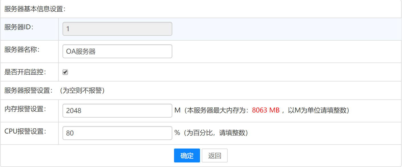 服务器监控的首要条件就是有服务器,系统默认有个OA服务器,我们也可以自己新建服务器,来实现服务器监控的一系列功能。服务器配置界面。