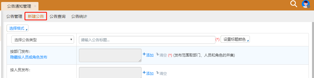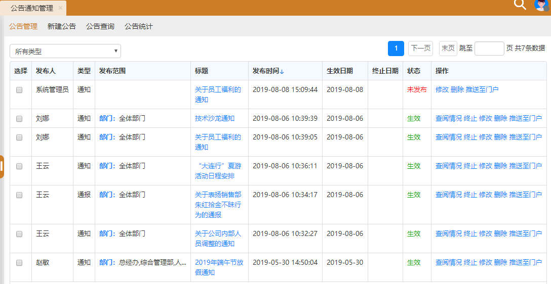 进入公告通知管理界面显示的公告通知为用户自己发布,或用户具备的“管理范围”内的部门公告(默认可以管理自己本部门用户发布的公告)