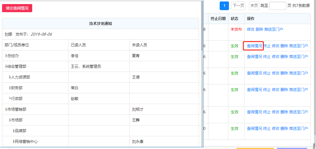 点击“查阅情况”可查看查阅过该通知的用户。