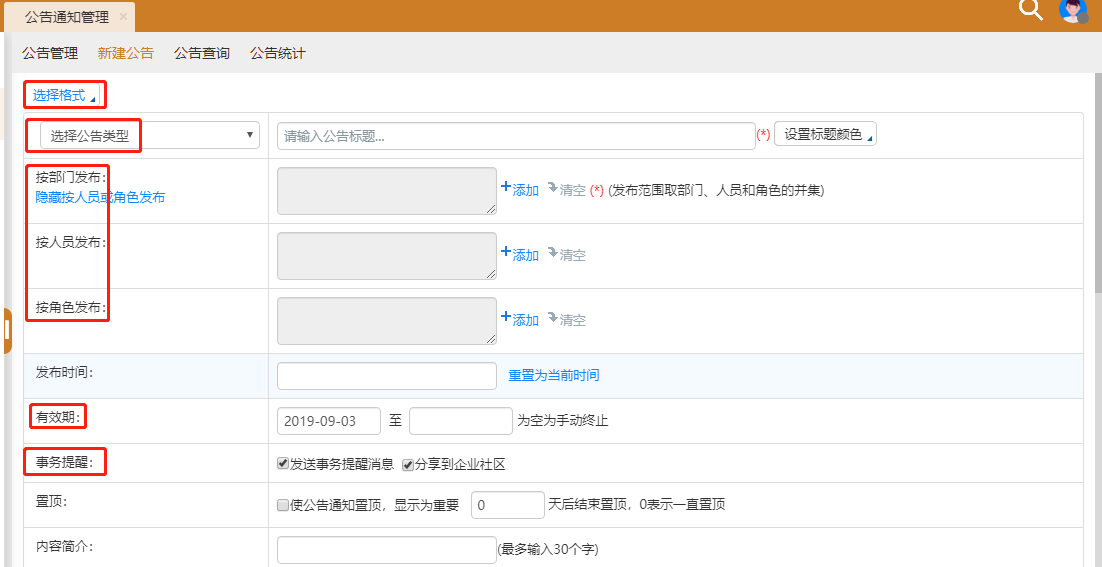 同时,公告通知的发布可以选择是否用内部短信和手机短信发送。