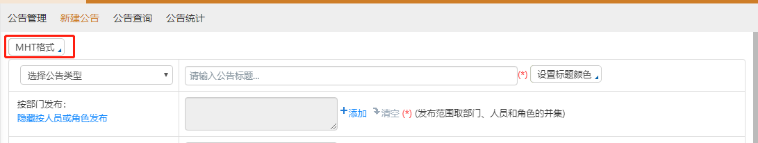 “MHT”格式的公告通知可实现图文混编,可以由各种文档或者网页保存为以“.mht”结尾的文件,并以此作为附件上传。查阅时,直接显示附件的内容。