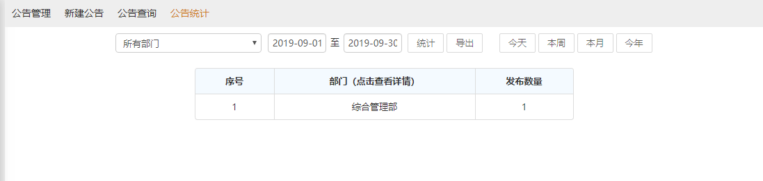 公告统计,可以更加直观的根据日期来查看各部门之间发送公告通知的数量。并且在点击带有“点击查看详情”标题栏下的数据时,可以支持数据穿透功能。
