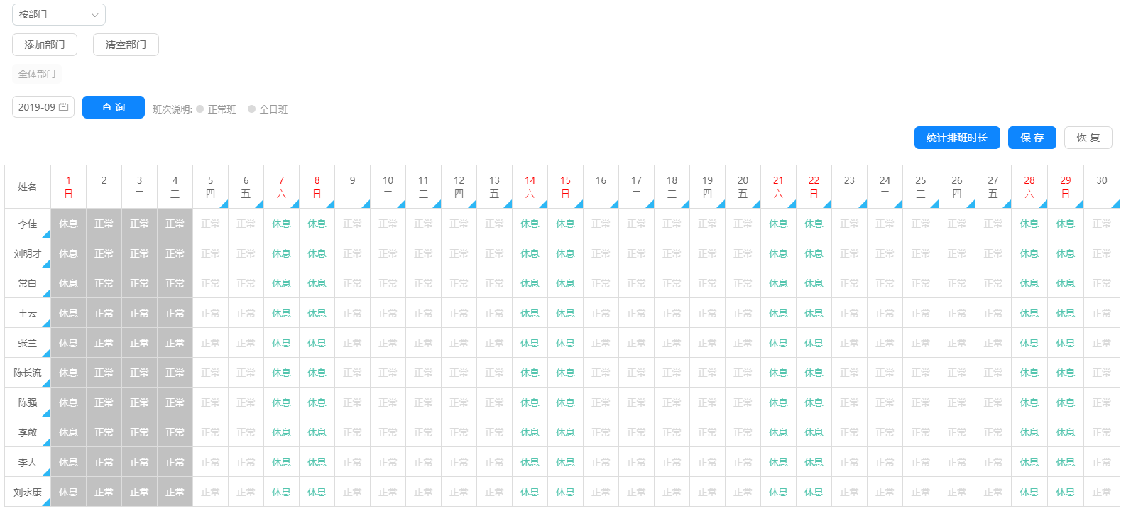 (3)自由排班中可根据部门或人员修改固定班次人员某月某日的班次,统计排班时长