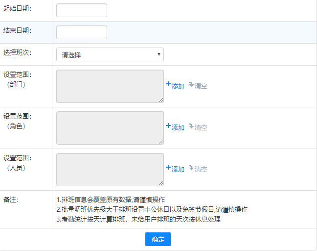 (4)批量调班管理:可以选择需要批量排班的时间段、排班类型、部门、人员、角色,点击确定后,批量排班保存成功;若在批量排班之前对以上时间段的部门人员已进行过排班,批量排班会覆盖之前的排班信息