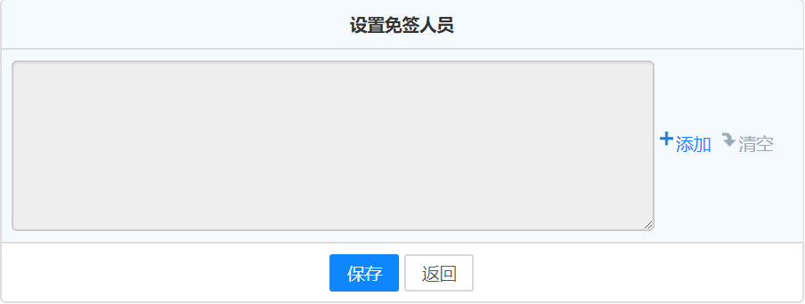 用户可设置上班不用签名登记的员工,方便对某些因为工作时常出差的员工的管理,在该界面中,添加了用户的姓名后,该用户就可以不用签到了,在个人考勤和考勤记录中都会提示该员工为免签人员。