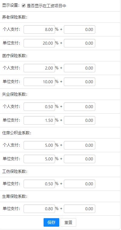 点击【保险系数设置】显示保险系数设置界面,用户可对各项保险系数进行设置,其中保险项目是根据保险基数乘以这里设置的比例计算得到的。保险系统设置界面。