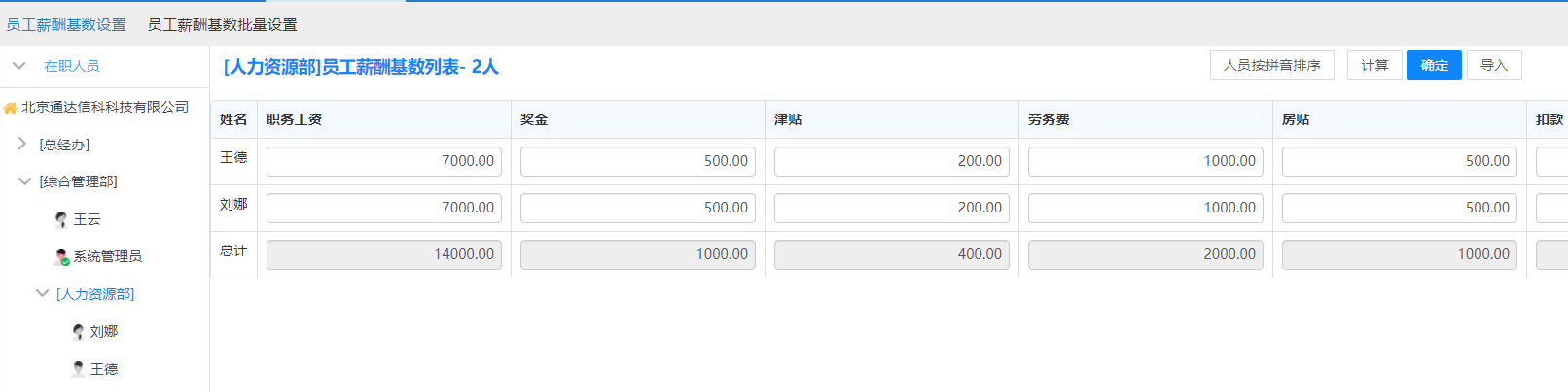 薪酬基数设置用于设置每一个员工的每一工资项的默认值,其中可以设置保险基数,点计算按钮会按照保险系数设置中所设置的比例计算出保险项的默认值,设置人员也可以对具体人员的默认值进行调整。该模块设置的默认值主要目的是:财务在做每一个月工资的时候,不用所有数据每次都重复录入,系统会读取这里设置的基数,财务人员只需做少量修改即可做完工资。