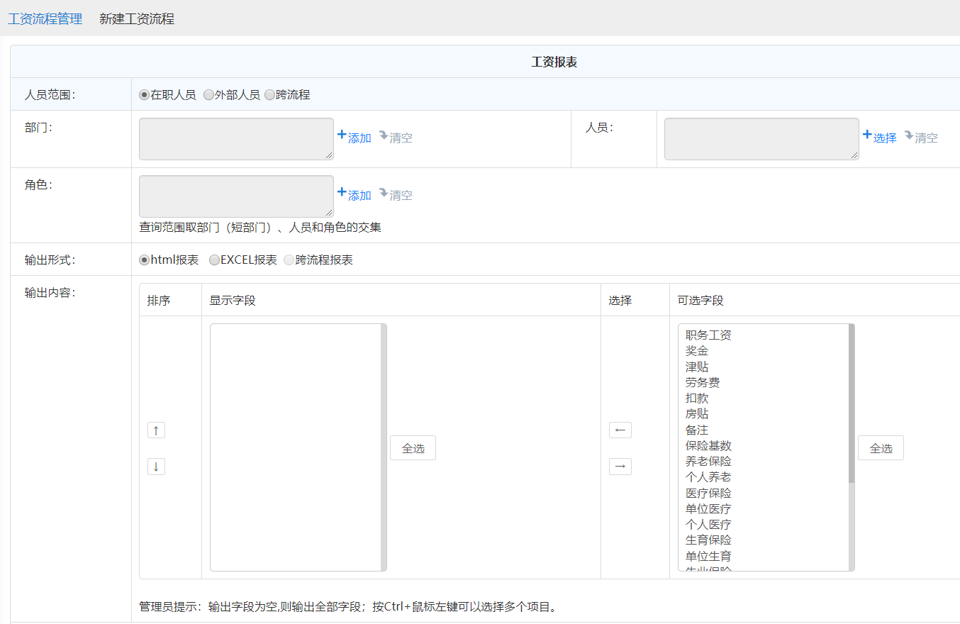 在工资流程管理中,点击【导出工资报表】,用户可以选择人员范围、导出形式、输出内容等,能快捷的导出比较高效适用的工资报表。
