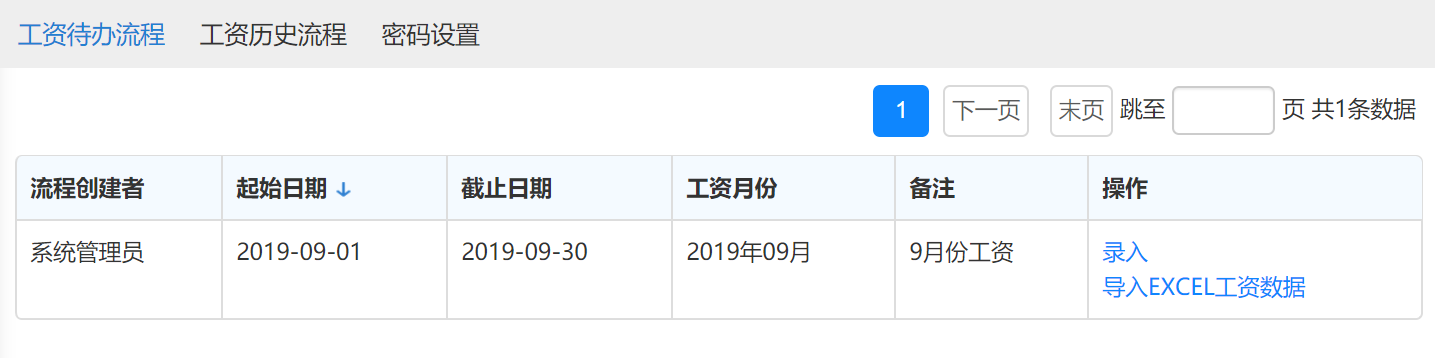 进入财务工资录入界面后,界面直接显示待办的工资流程列表,财务人员可点击操作下的【录入】进行部门或者单个员工的工资录入;用户也可以选择EXCEL导入。财务工资录入界面。
