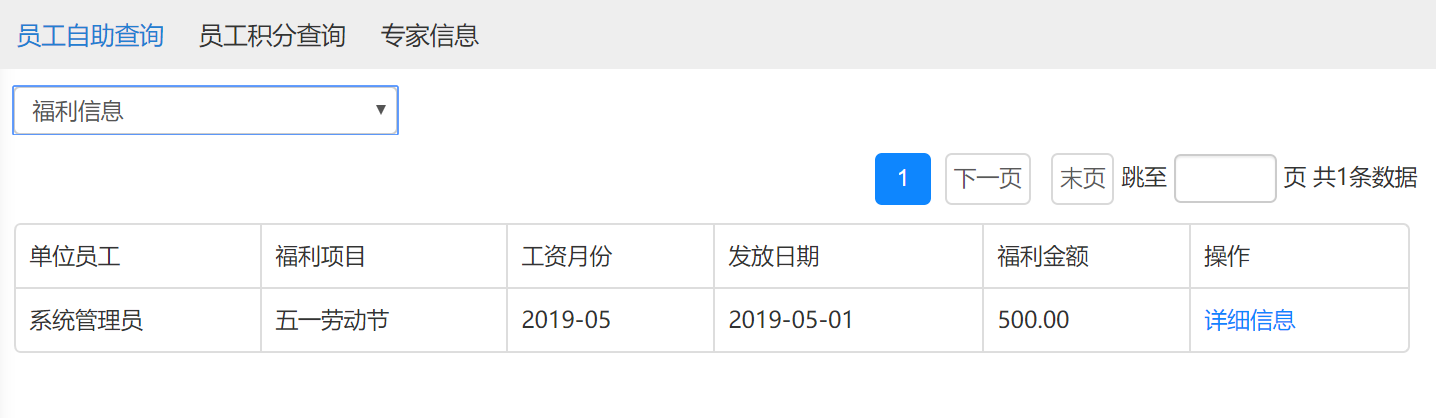 在员工福利查询中,可以根据员工的姓名、福利项目、工资月份等数据内容,查询员工的福利记录信息,查询记录集中用户有修改和删除等操作。