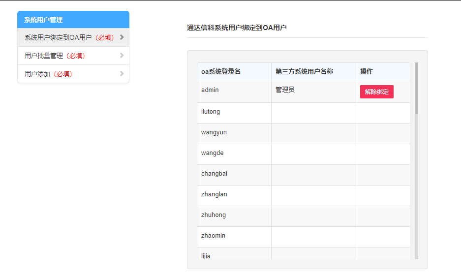在“系统用户绑定到OA用户”中可以看到被绑定的用户,同样也可以对绑定的用户进行解绑。