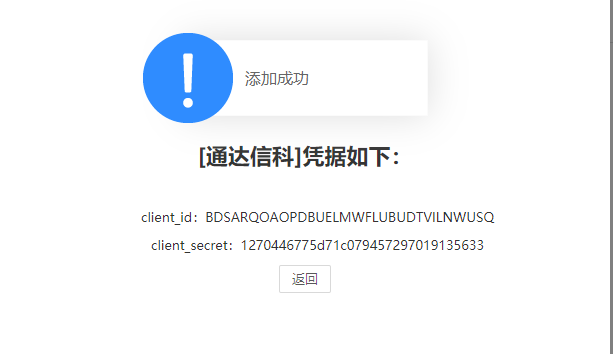 在图4.15-4中输入相应的系统名称、描述、应用地址(应用地址格式如下 例:http://127.0.0.1) 然后点击【保存】,则会自动生成client_id和client_secret凭据: