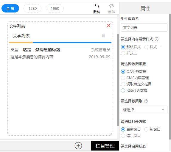 自由组件的数据来源包含:OA业务数据、CMS内容管理、CMS自定义页面、调取自定义栏目、自定义链接、RSS订阅数据,不同的组件适用不同的数据来源;