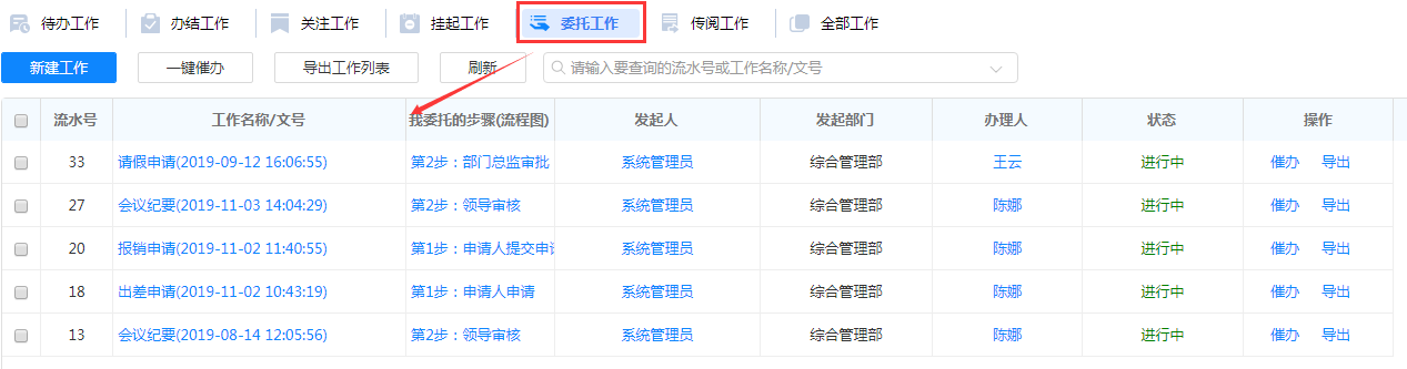 可以设置委托规则,在我的工作->委托工作中可以查看个人的委托记录。
