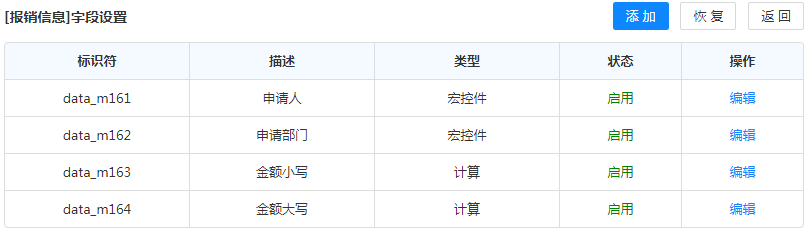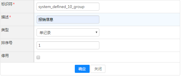 注: 1)新建的【报销信息】分组中添加了字段(控件),则无法对【申请信息】分组进行删除。如想删除,需将分组中的字段全部删除,则分组即可删除。删除的分组,在恢复中可以进行恢复或彻底销毁。 2)字段已生成数据,则无法对字段进行删除,只能停用