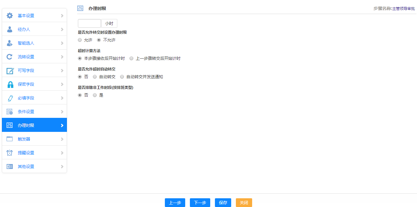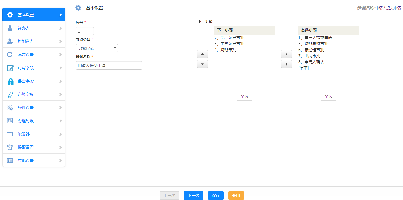 下一步骤:可以选择一个或多个分支步骤,如不选择,则系统按照顺序自动选择下一步骤。比如:步骤1的下一步骤设置为步骤3,则表示可以跳过步骤2直接流转至步骤3;也可以设置为多个分支,比如步骤1的下一步骤设为步骤2和步骤3,则表示流程的主办人可选择其中的一个流程分支,既可以是步骤2也可以是步骤3。下一个步骤的分支没有总数限制,如设置了[结束流程],表示可以在步骤转交时,直接结束流程。充分利用下一步骤的设置,用户就可以设计出复杂的业务流程,满足业务灵活多变的需要。