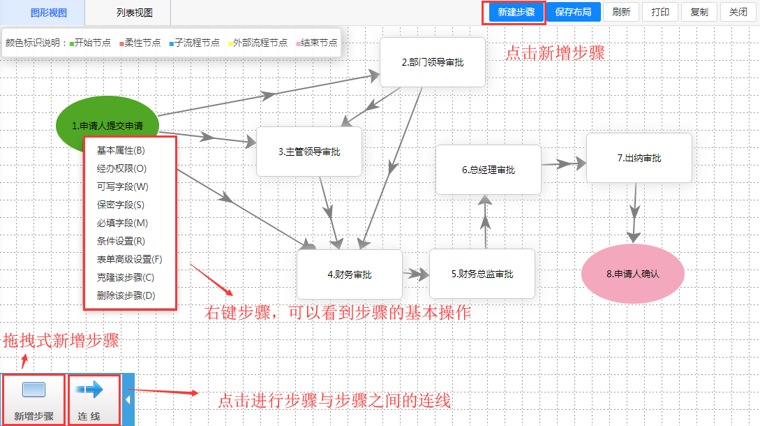 以上是一个已经定义好步骤的流程图,拖拽【新建步骤】按钮可以快速新建步骤;点击【连线】可以快速定位某步骤的下一步。双击步骤方框,可以编辑该步骤的基本属性,在步骤方框上右击,可以看到该步骤的设置属性。